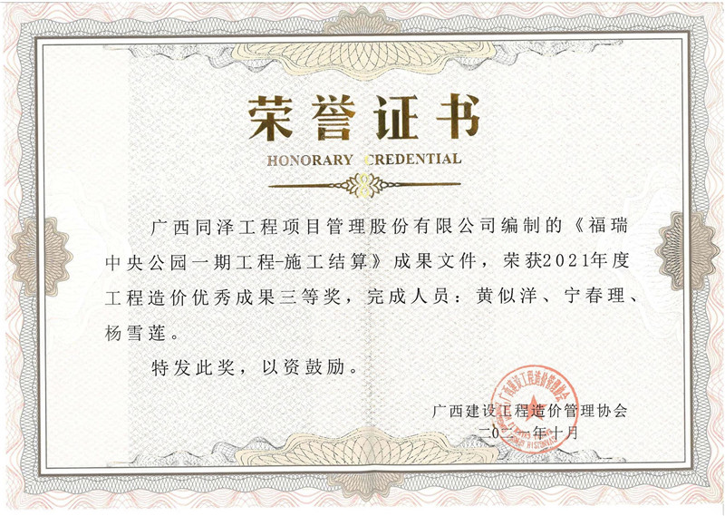 《福瑞中央公園一期工程-施工結算》榮獲2021年度工程造價優(yōu)秀成果三等獎