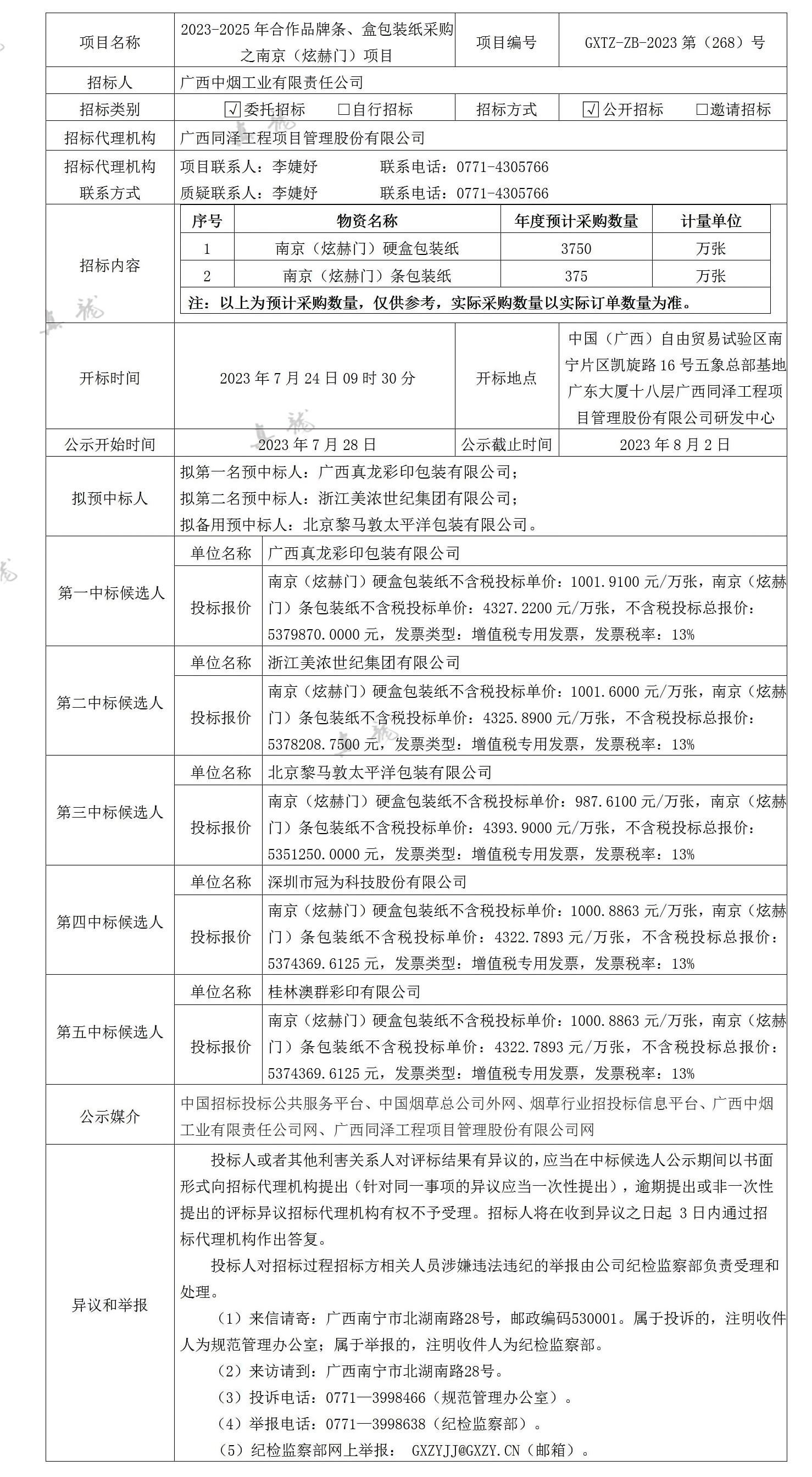 廣西中煙工業(yè)有限責(zé)任公司2023-2025年合作品牌條、盒包裝紙采購之南京(炫赫門)項(xiàng)目(項(xiàng)目編號:GXTZ-ZB-2023第(268)號)中標(biāo)候選人公示