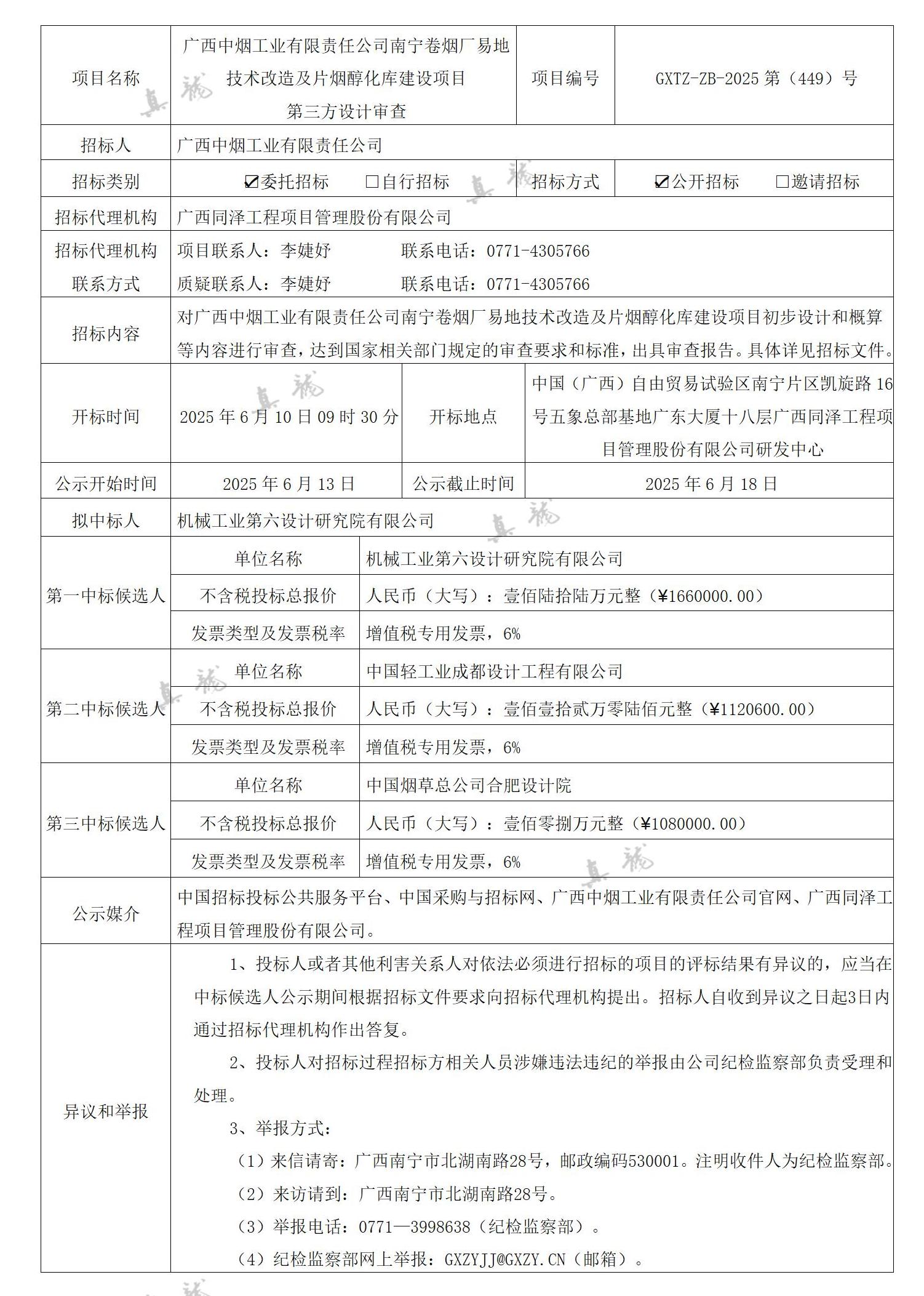 廣西中煙工業(yè)有限責(zé)任公司南寧卷煙廠易地技術(shù)改造及片煙醇化庫(kù)建設(shè)項(xiàng)目第三方設(shè)計(jì)審查(項(xiàng)目編號(hào):GXTZ-ZB-2025第(449)號(hào))中標(biāo)候選人公示