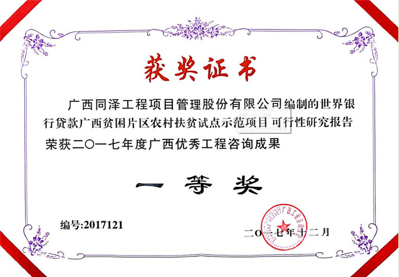 世辦銀行貸款廣西貧困片區(qū)農(nóng)村扶貧試點(diǎn)示范項(xiàng)目可行性研究報(bào)告榮獲2017年度廣西優(yōu)秀工程咨詢成果一等獎(jiǎng)