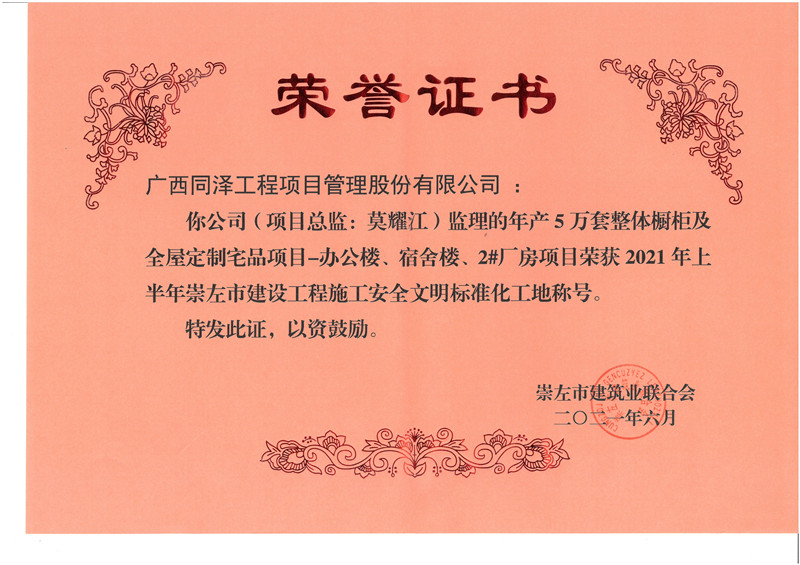 年產(chǎn)5萬套整體櫥柜及全屋定制宅品二期項(xiàng)目榮獲2021年崇左市安全文明工地
