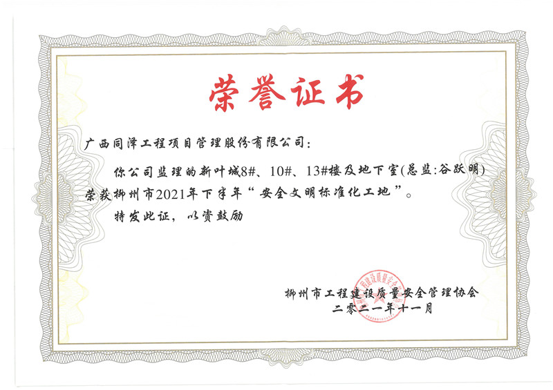 柳州新葉城項(xiàng)目8#、10#、13#樓及地下室項(xiàng)目榮獲柳州市2021年下半年安全文明標(biāo)準(zhǔn)化工地