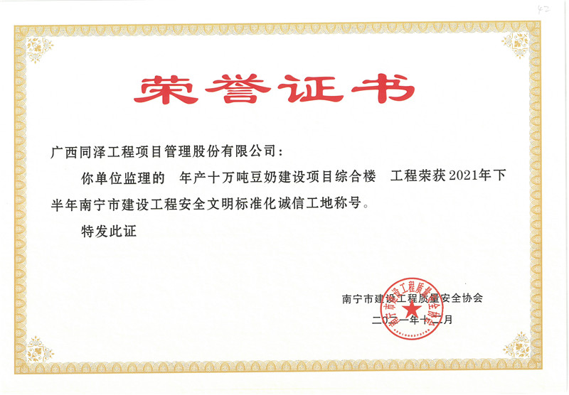 年產(chǎn)十萬噸豆奶建設(shè)項(xiàng)目綜合樓項(xiàng)目榮獲2021年下半年南寧市建設(shè)工程安全文明標(biāo)準(zhǔn)化誠(chéng)信工地稱號(hào)