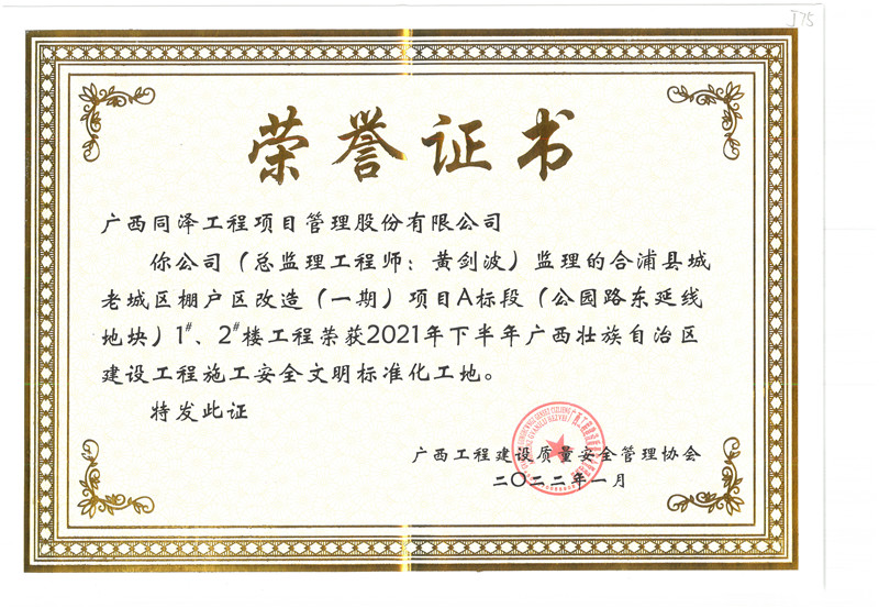 合浦縣城老城區(qū)棚戶區(qū)改造(一期)項(xiàng)目A標(biāo)段項(xiàng)目榮獲2021年(下半年)廣西壯族自治區(qū)建設(shè)工程施工安全文明標(biāo)準(zhǔn)化工地